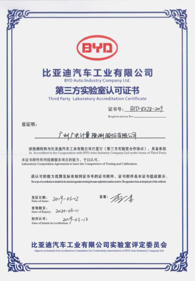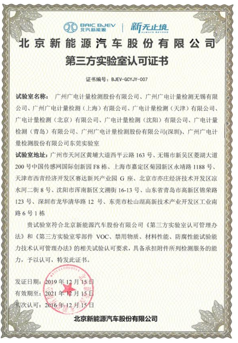 作为国内为数不多已完成AEC-Q100、AEC-Q101、AEC-Q102、AEC-Q103、AEC-Q104、AEC-Q200完整验证报告的第三方检测机构——广电计量拥有国家级的资质,如:原国家信息产业部军工电子602计量测试站、国家CNAS实验室认可、中国计量认证(CMA)实验室、国防实验室(DILAC)、总装军用实验室、二级保密单位、美国UL认可实验室(安全),同时也是众多主机厂与一级供应商认证的第三方实验室,如:吉利汽车、长城汽车、江淮汽车、奇瑞汽车、东风日产、广汽菲亚特、一汽大众、法雷奥、大陆集团、捷普、麦格纳、马瑞利、博世、西门子。